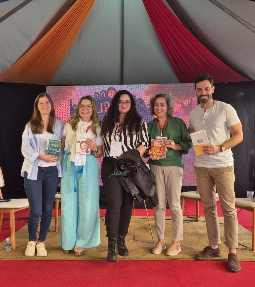 O tema foi “Literatura e Família – Maternidade, Paternidade e dramas familiares na literatura contemporânea”. Fiz a mediação e meus colegas de mesa foram: Karine Asth, Cibele Laurentino, Guilherme de Marchi e Jaqueline Lima. Meu trabalho ficou mais gostoso porque eu já conhecia todos os participantes, uma grata surpresa do destino. Falamos sobre os silêncios que temos em família, parentalidade, expectativas, saudades, lutos e, é claro, sobre a influência da família na nossa literatura.